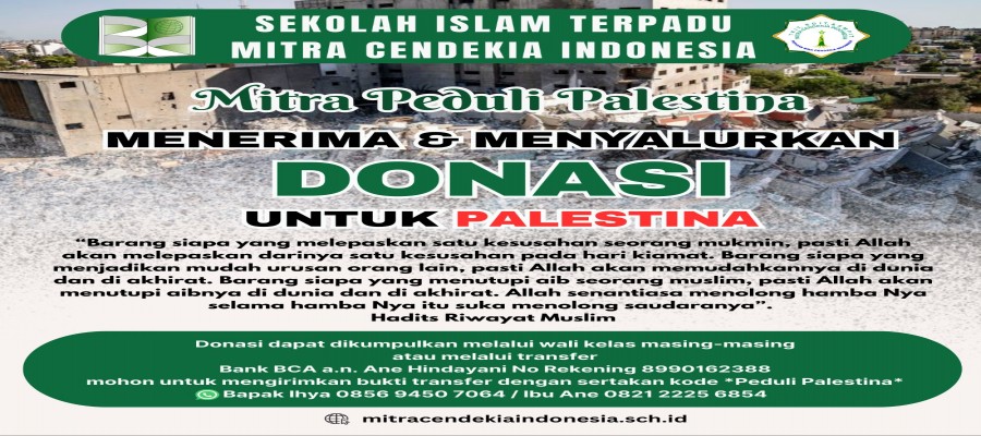 Bapak/Ibu, sekolah islam terpadu Mitra Cendekia Indonesia melakukan pengumpulan donasi sebagai bentuk peduli sesama umat muslim di Palestina. Semoga bapak dan ibu berkenan untuk turut serta dalam program ini.